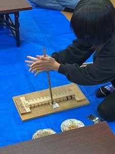 ・「ヒキリ棒」をキリのように回転する。コツは次の2つ。@「ひきり棒」をくぼみから離さないこと、離すと熱が逃げてしまう。A初めはゆっくり回転し、木屑がV字の谷にたまりはじめ煙がでてきたらラストスパートでがんばる。もうもうと煙が発生し、木屑の中に赤い火種が見えたらOK。息を吹きかけるとより大きな火種になる。おそらく1回で手が痛くなる。
