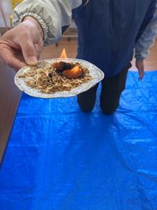 ・「火種」を乾燥したカンナ屑(薄く削ったものを乾燥しておく)の中に入れて息を吹きかける。もうもうと煙があがり、煙で目が痛くなるころにポッと炎が上がる。以前、麻ヒモをほぐしたものを使った時にはすぐ炎があがった。綿や枯れ草も使える。