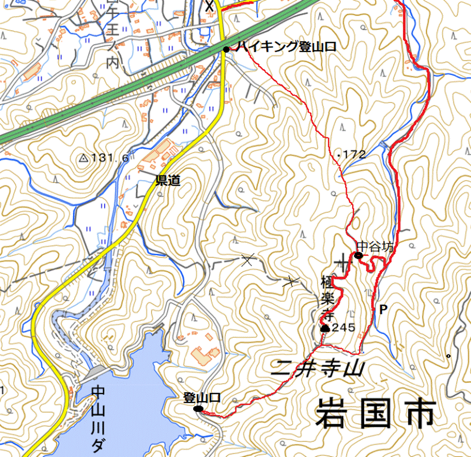 ・国道2号線「岩国市周東総合支所前交差点」から約3.1km南下し、「食肉センター入口」標識がある分岐で左に入る。その先600mの霊園前で左折すると中山湖一周道路になり、約400m先に「二位寺山登山口」がある。